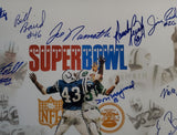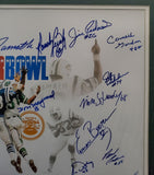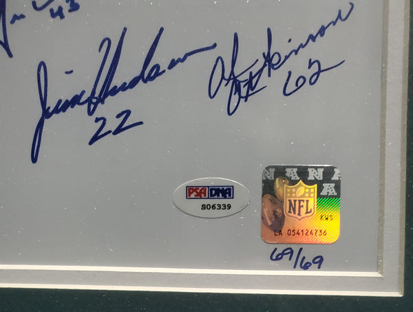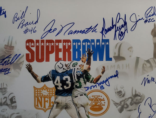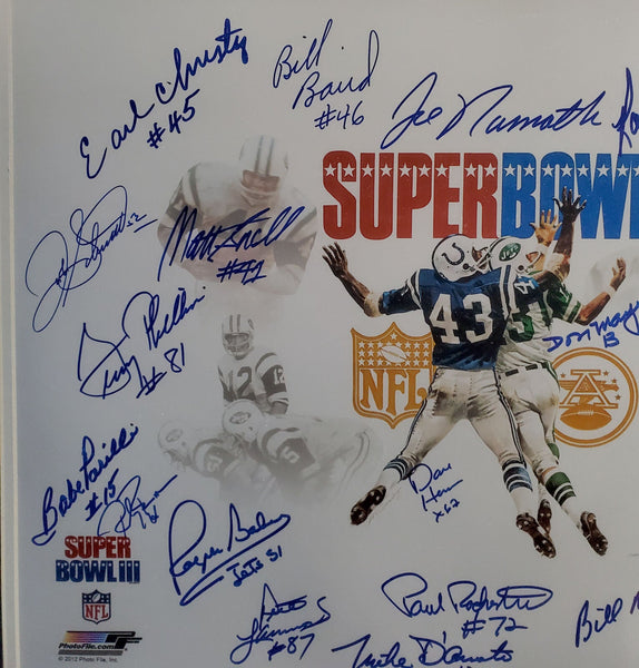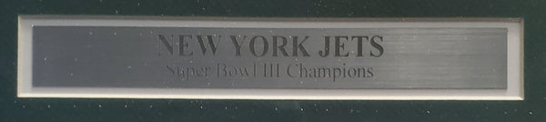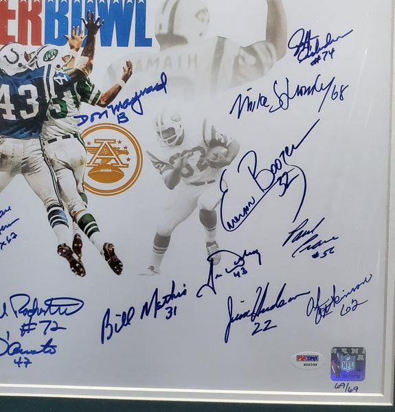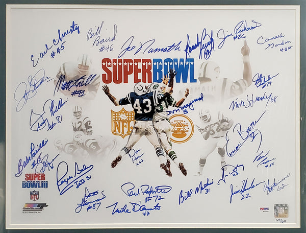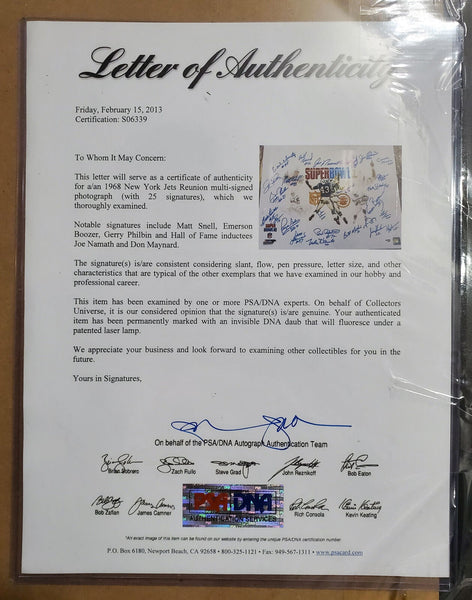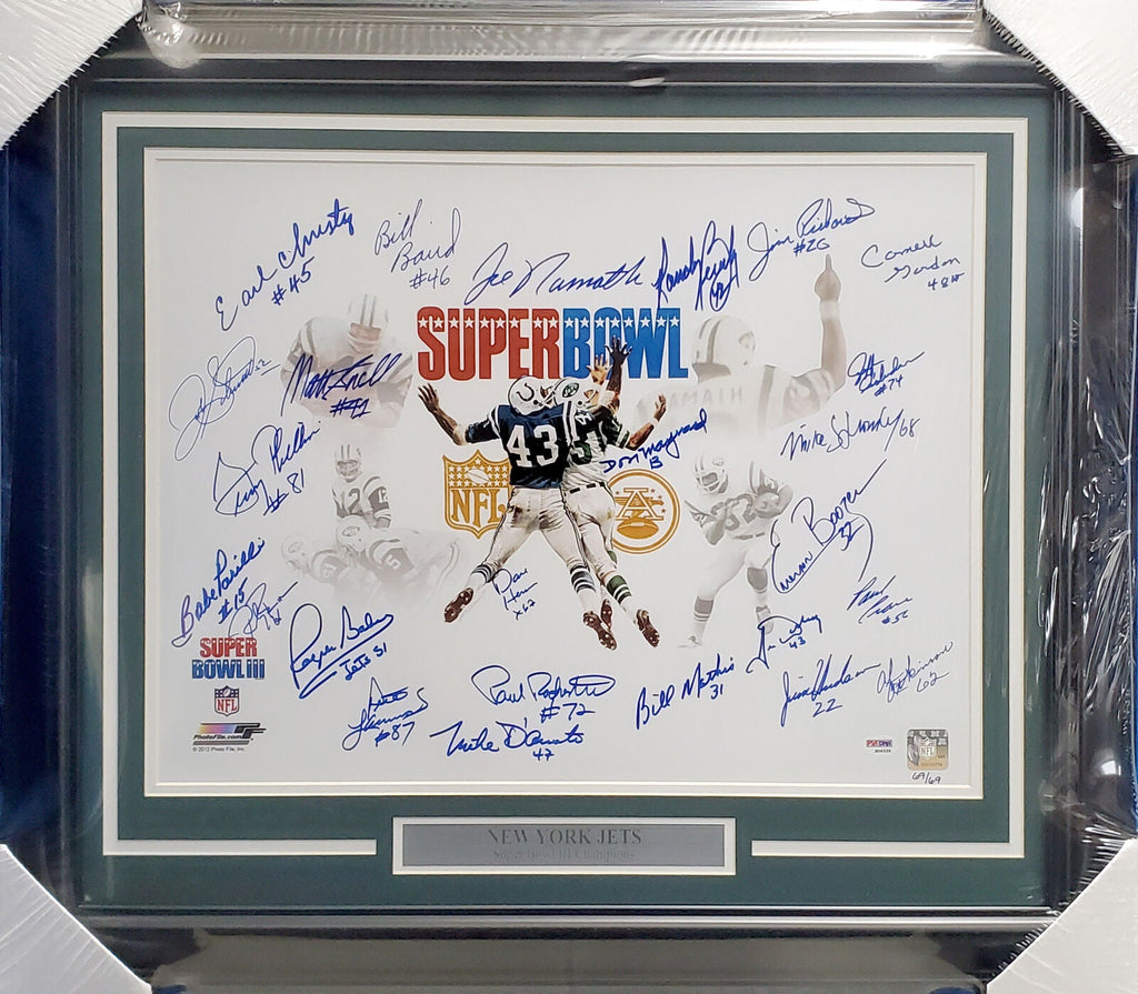 This is a framed 16x20 Photo, approximately 24x28 with the frame, that has been hand signed by 25 members of the 1968 Super Bowl III Champion New York Jets. Notable members include: Joe Namath, Don Maynard, Matt Snell, Emerson Boozer, & Gerry Philbin. It has been certified authentic by PSA/DNA and comes with their sticker and matching full-page certificate of authenticity.