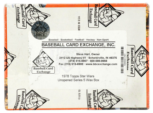 This is for one (1) unopened Wax box of 1977-78 Topps Star Wars Series 5 trading cards, which has been professionally wrapped and sealed by BBCE, ensuring that the packs inside have not been tampered with. The box contains 36 unopened packs. You will receive the BBCE Wrapped box shown in image.