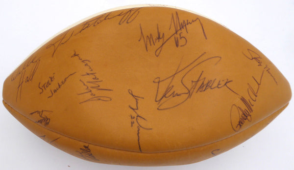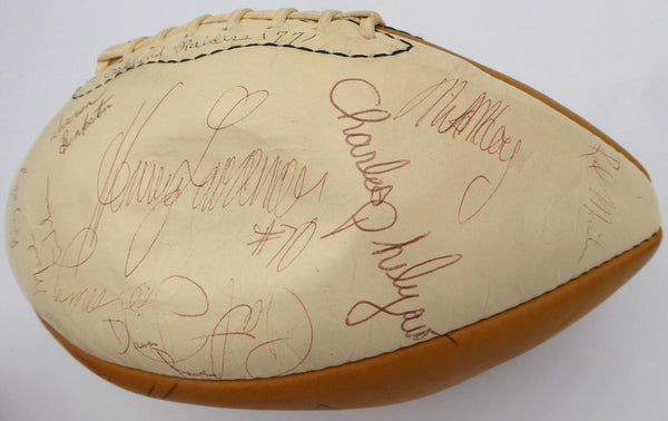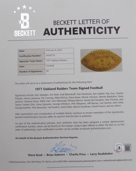 This is a Rawlings Football that has been hand signed by 40 members of the 1977 Oakland Raiders. Signatures include John Madden, Art Shell, Fred Biletnikoff, Ted Hendricks, Ken Stabler, Ray Guy, Charles Philyaw, Henry Lawrence, Pat Toomay, Mike McCoy, Dave Rowe, Monte Johnson, Warren Bankston, Steve Jackson, Clarence Davis, Willie Hall, John Matuszak, Mickey Marvin, Randy McClanahan, Skip Thomas, Jack Tatum, Hubert Ginn, Steve Sylvester, George Atkinson, Phil Villapiano, Jeff Barnes, Carl Garrett, John Vella, George Buehler, Pete Banaszak, Ted Kwalick, Dave Dalby, Morris Bradshaw, David Humm, and six others. This item has been certified authentic by Beckett Authentication (BAS) and comes with their tamper-proof QR Code sticker that can be verified on the Beckett-authentication.com. NOTE: The football is flat and doesn't hold air. It still displays nice.