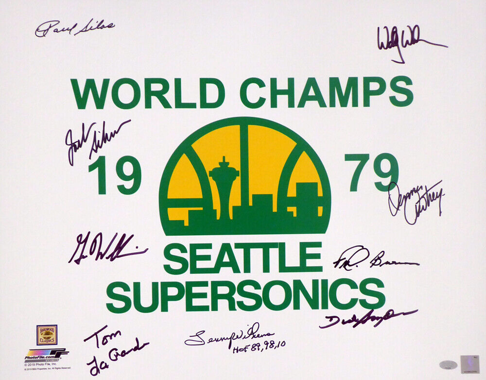 This is a 16x20 Photo that has been hand signed by 9 members if the 1978-79 NBA Champions Seattle Supersonics. Signatures include Lenny Wilkens, Fred Brown, Gus Williams, Jack Sikma, Paul Silas, Wally Walker, Dennis Awtrey, Dick Snyder & Tom LaGarde. This item was signed in the presence of a Mill Creek Sports representative and comes with their serial numbered hologram and matching certificate of authenticity. We have a few of these in stock. Autograph size and location may vary, but will be of equal quality.
