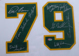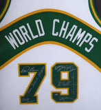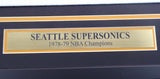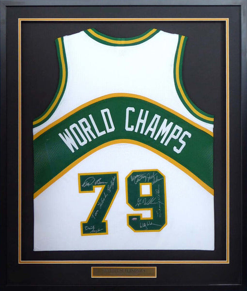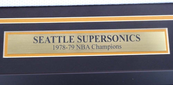 This is a Framed Jersey, Approximately 31x36 with the frame, that has been hand signed by 9 members if the 1978-79 NBA Champions Seattle Supersonics. Signatures include Fred Brown, Gus Williams, Jack Sikma, Lenny Wilkens, Paul Silas, Wally Walker, Dennis Awtrey, Dick Snyder & Tom LaGarde. This is a custom jersey with no name brand. The approximate size is XL. It has nice sewn in name and numbers. This item was signed in the presence of a Mill Creek Sports representative and comes with their serial numbered hologram and matching certificate of authenticity. We have a few of these in stock. Autograph size and location may vary, but will be of equal quality.
