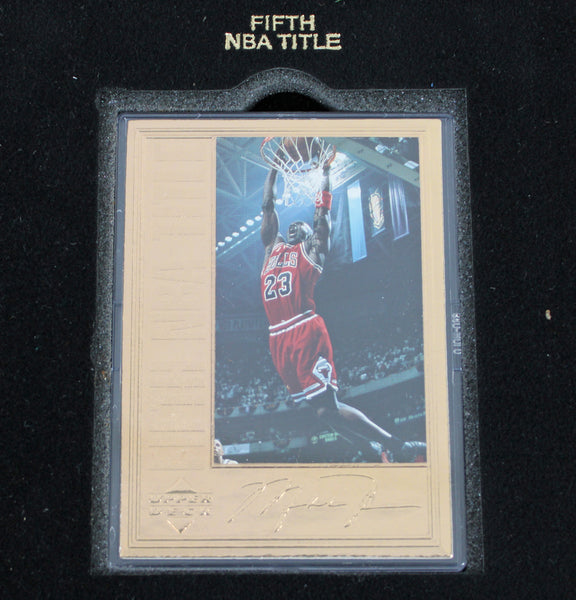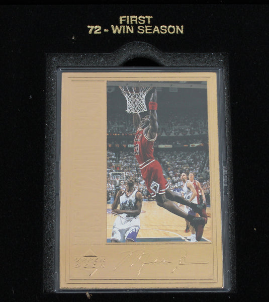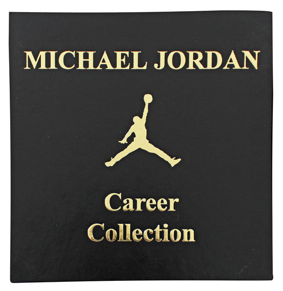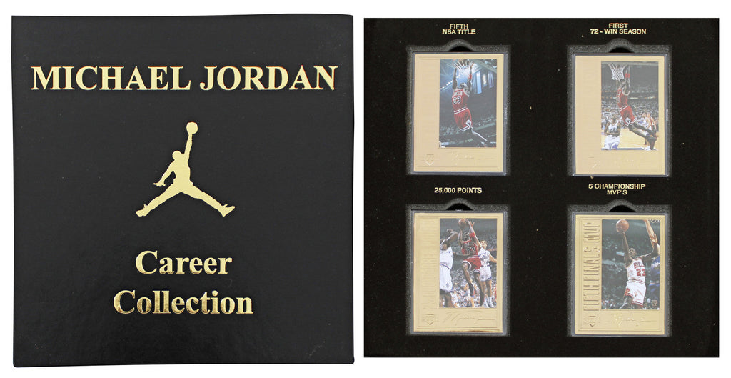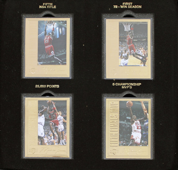 This is a 1996 Upper Deck Michael Jordan Career Collection 4 Card Set Numbered To 10000 22 Kt Gold. This set of 4 cards will come with the display binder. The binder would not be considered mint. These cards are not autographed.