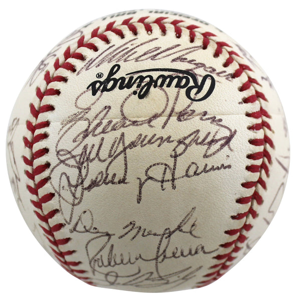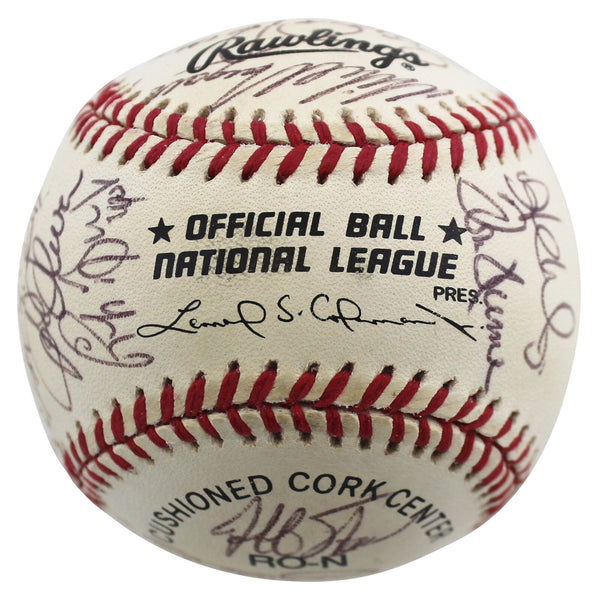 This Autographed Leonard Coleman Onl Baseball has been Personally Signed by Ray Knight, Mike Morgan, Eduardo Perez, Joel Youngblood, Lenny Harris, Denis Menke, Ruben Sierra, John Smiley, Jeff Shaw, Eddie Taubensee, Bret Boone, Reggie Sanders, Jeff Brantley, Terry Pendleton, Joe Oliver, Dave Burba, Joey Eischen, Ricky Bones, Ken Griffey Sr., Tom Hume, Don Gullett, Chris Stynes, Hal Morris and Brook Fordyce. of the Cincinnatti Reds. This item is 100% Authentic to include a Certificate of Authenticity (COA) / hologram by Beckett Authentication Services. The authenticity can be verified on Beckett Authentication Services website.