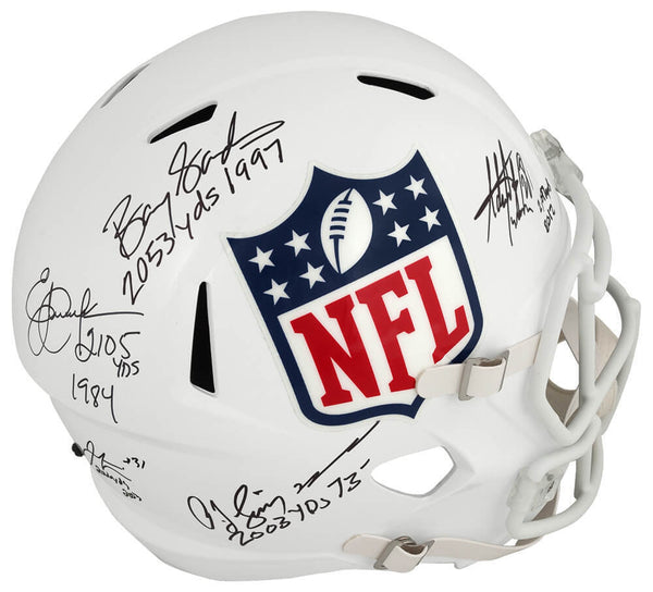 NFL 2,000 Yard Rushing Club signed NFL logo Riddell full size speed replica helmet. Helmet is signed by 5 members of the 2,000 Yard Rushing Club, they include: Eric Dickerson with '2105 Yds 1984', Adrian Peterson with '2097 Yds 2012', Jamal Lewis with '2066 Yds 2003', Barry Sanders with '2053 Yds 1997', and O.J. Simpson with '2003 Yds 1973'. All 5 running backs rushed for over 2,000 yards in a single NFL season and have also included the total yards they had during the season they did it. Item comes with a Schwartz Sports Memorabilia tamper-proof numbered hologram and Certificate of Authenticity which can be verified online.