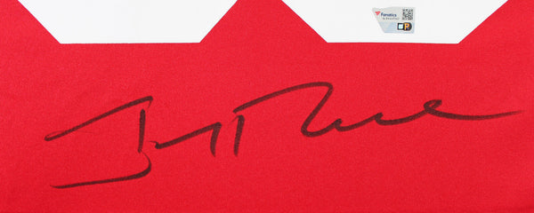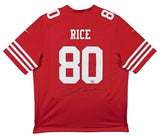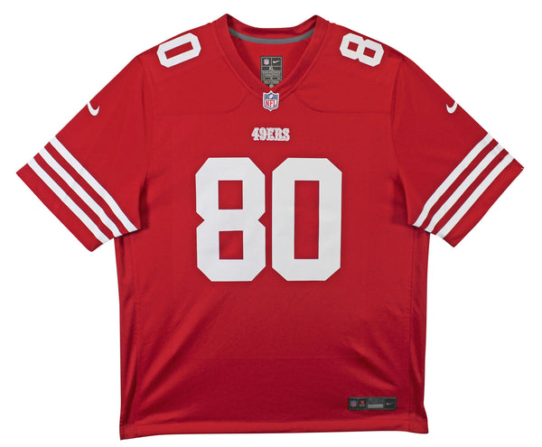 This Autographed Red Nike Game Jersey has been Personally Signed by Jerry Rice of the San Francisco 49ers. This item is 100% Authentic to includes a numbered hologram by Fanatics. We conducted an autograph signing with Jerry Rice where multiples of the same item were signed. While the photographs are representative of this item, the size, placement and strength of the signature may vary. Each item is hand signed, therefore, each autograph is unique. This item can be verified through Fanatics. Multiple sizes available. Reach out for availability.