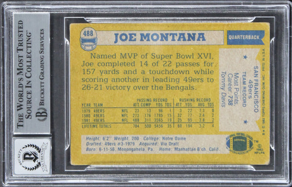 This Autographed Auto Graded Gem Mint 10! 1982 Topps #488 Card has been Personally Signed by Joe Montana of the San Francisco 49ers. This item is 100% Authentic, it comes slabbed and authenticated by Beckett Authentication Services. The authenticity can be verified on Beckett Authentication Services website.