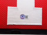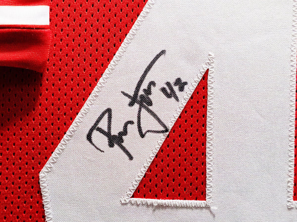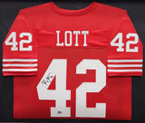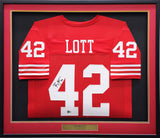 This is a framed Red Jersey, approximately 31x36 with the frame, that has been hand signed by Ronnie Lott. This item has been witnessed and certified authentic by Beckett Authentication (BAS) and comes with their tamper-proof witness hologram.