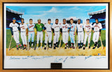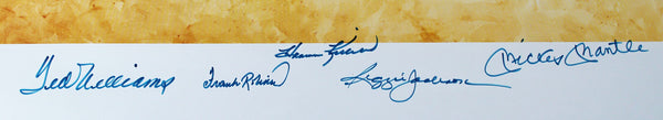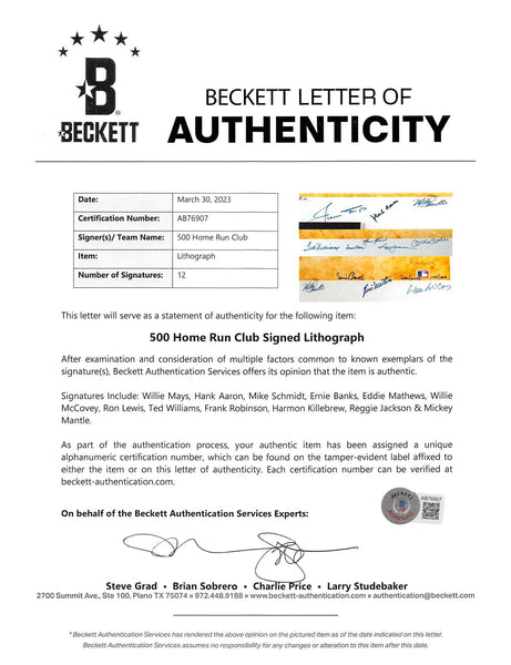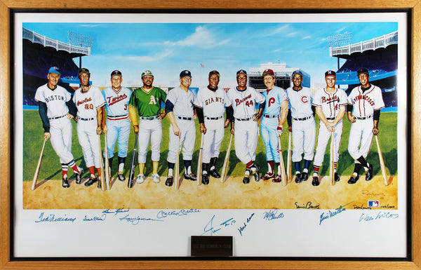 This Autographed & Framed 23.5x38 Lithograph has been Personally Signed by Willie Mays, Hank Aaron, Mike Schmidt, Ernie Banks, Eddie Mathews, Willie McCovey, Ron Lewis (artist), Ted Williams, Frank Robinson, Harmon Killebrew, Reggie Jackson & Mickey Mantle. This item is 100% Authentic to include a Certificate of Authenticity (COA) / hologram by Beckett Authentication Services. The authenticity can be verified on Beckett Authentication Services website. This item has been professionally framed to overall dimensions of approximately 26 x 40 inches.