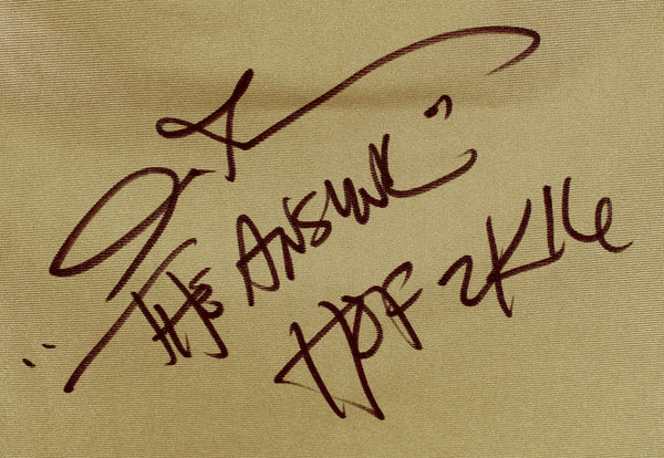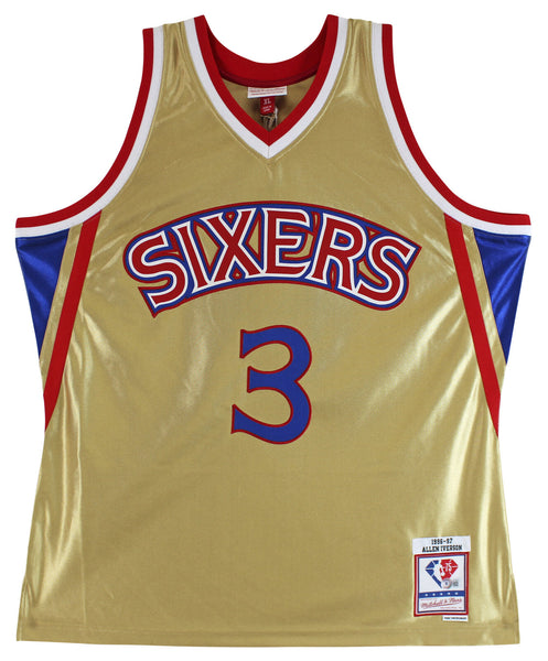 This Autographed Gold Mitchell & Ness 75th Anniversary Jersey with the inscription of "The Answer HOF 2K16" has been Personally Signed by Allen Iverson of the Philadelphia 76ers. This item is 100% Authentic to include a Certificate of Authenticity (COA) / hologram by Beckett Authentication Services. This is a BAS Witnessed Protection Program item which means a Beckett Authentication Service representative was present when this item was being signed. We conducted an autograph signing with Allen Iverson where multiples of the same item were signed. While the photographs are representative of this item, the size, placement and strength of the signature may vary. Each item is hand signed, therefore, each autograph is unique. This item can be verified through BAS Witnessed. This is a X-Large sized Jersey. This will be shipped in a Pop Protector, each will have some handling wear from shipment to the signing and back. These would not be considered mint.