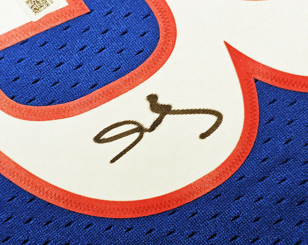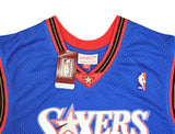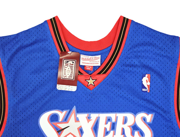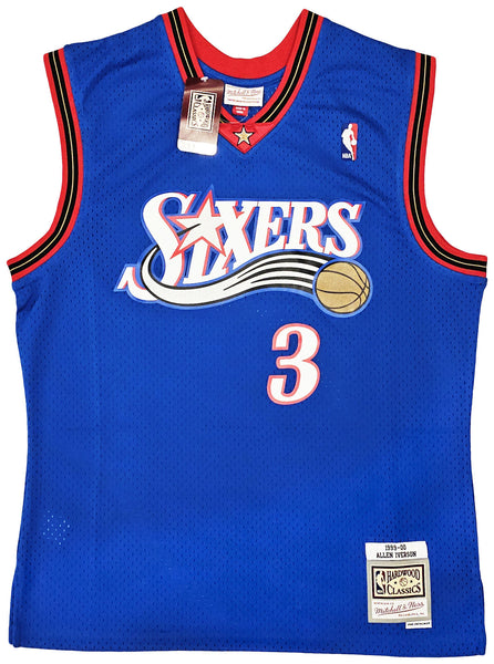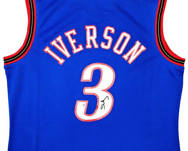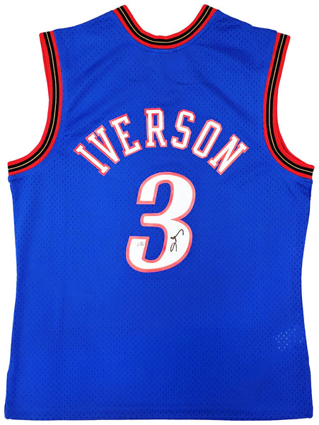 This is a Blue Authentic Mitchell & Ness Philadelphia 76ers 1999-00 HWC Swingman Jersey that has been hand signed by Allen Iverson. This jersey is Size L. This item has been witnessed and certified authentic by Beckett Authentication (BAS) and comes with their tamper-proof witness sticker.