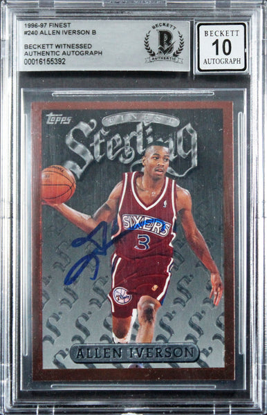 This Autographed Auto Graded Gem Mint 10! 1996 Finest #240 Rookie Card has been Personally Signed by Allen Iverson of the Philadelphia 76ers. This item is 100% Authentic, it comes slabbed and authenticated by Beckett Authentication Services. We have multiples of this same item. While the photographs are representative of this item, the size and placement of the signature may vary. Each item is hand signed, therefore, each autograph is unique.