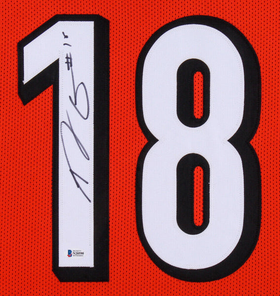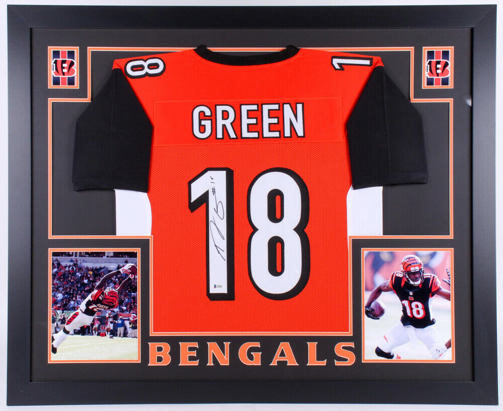 Custom frame measures approximately 35" x 43" in size which has been hand-signed in black felt-tip pen by A. J. Green. Includes an official Beckett Authentication Services serially numbered hologram and matching COA for authenticity purposes. The signing of this item was witnessed by Beckett.Authentication: Beckett COA