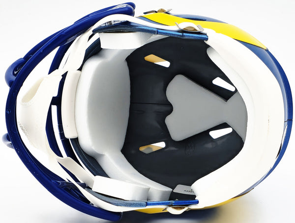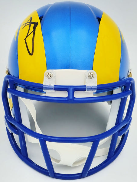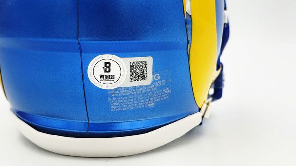 This is a Los Angeles Rams Blue Speed Mini Helmet that has been hand signed by Aaron Donald. This item has been witnessed and certified authentic by Beckett Authentication (BAS) and comes with their tamper-proof witness sticker.