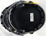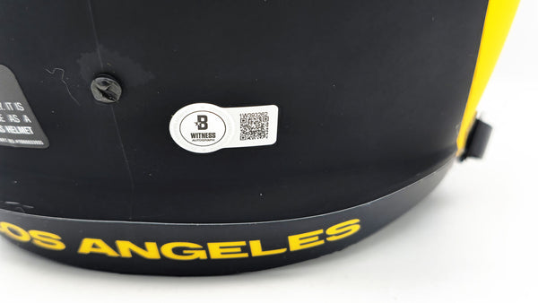 This is a Los Angeles Rams Eclipse Black Full Size Speed Replica Helmet that has been hand signed by Aaron Donald. The Eclipse helmets are delicate and may have some marks or scratches on them. This item has been witnessed and certified authentic by Beckett Authentication (BAS) and comes with their tamper-proof witness sticker.