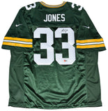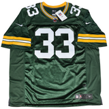 Aaron Jones, star running back for the Green Bay Packers, has hand signed this Nike Limited jersey at a private signing. Jersey is new with tags attached and all letters/numbers are stitched on. This item is authenticated by Beckett Authentication Services and was signed in the presence of one of their representatives. Their tamper-evident hologram featuring a QR code and serial number is on the item. The authenticity can be verified online by entering the serial number or scanning the QR code. Item pictured may not be the exact item you will receive. It will be similar quality, and we guarantee your satisfaction.