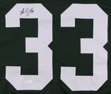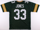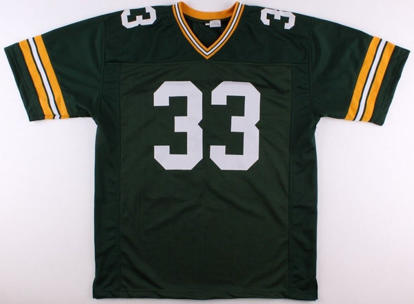 Custom on-field style jersey. Everything sewn on, size XL. Hand-signed in black felt-tip pen by Aaron Jones. The lot / autograph(s) includes an official James Spence Authentication (JSA) hologram and matching COA for authenticity purposes. The signing of this item was witnessed by JSA.Authentication: JSA COACustom on-field style jerseys are a more affordable option for autograph seekers. These jerseys do not have any brand name or tags and are made in the Philippines. They feature stitched on names and numbers and are made to look very similar to the on-field jerseys that the players wear. These custom jerseys are very commonly used in the memorabilia industry.