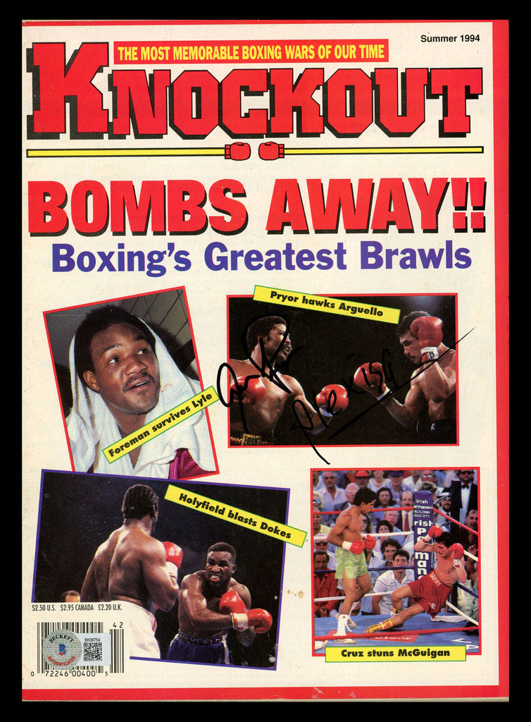 This is a KO Magazine that has been hand signed by Aaron Pryor & Alexis Arguello. There are marks on the item as shown. This item has been certified authentic by Beckett Authentication (BAS) and comes with their tamper-proof QR Code hologram that can be verified on the Beckett-authentication.com.
