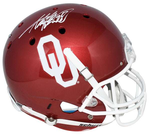 Adrian Peterson, former All-American running back for the Sooners, has hand signed this Oklahoma Schutt full-size replica helmet at a private signing. This item comes with a certificate of authenticity (COA) from Beckett Authentication Services and was signed in the presence of one of their representatives. You will receive a serial-numbered COA along with a matching serial-numbered sticker on the helmet. The authenticity can be verified online by entering the serial number.Item pictured may not be the exact item you will receive. It will be similar quality, and we guarantee your satisfaction.
