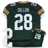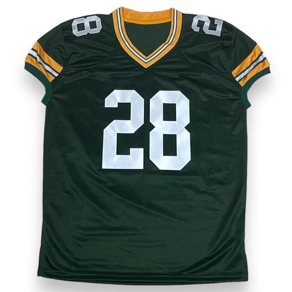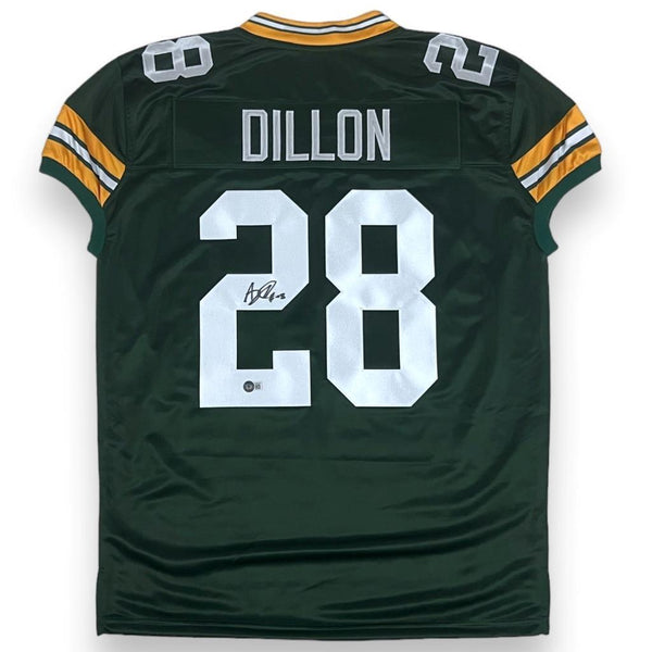 This signed item is brand new without tags or logos. This jersey is a size Large / XL. All letters and numbers are sewn on. This item will make a great gift or a great addition to any collection at an AFFORDABLE PRICE! ATHLETE: AJ Dillon ITEM: Game Cut Style Custom Jersey AUTHENTICATION: This item comes with a Beckett serial #'ed hologram affixed to the item. To ensure authenticity, the hologram can be reviewed online. This process helps to ensure that the product purchased is authentic and eliminates any possibility of duplication or fraud. NOTE: All of our autographed jerseys are custom jerseys, unless otherwise noted. Our custom jerseys are NON-BRANDED, have NO logos, NO tags, NO patches, NO emblems. Pro tackle twill letters and numbers. The non-branded jerseys are made specifically for the player(s) to sign, for collectible purposes.