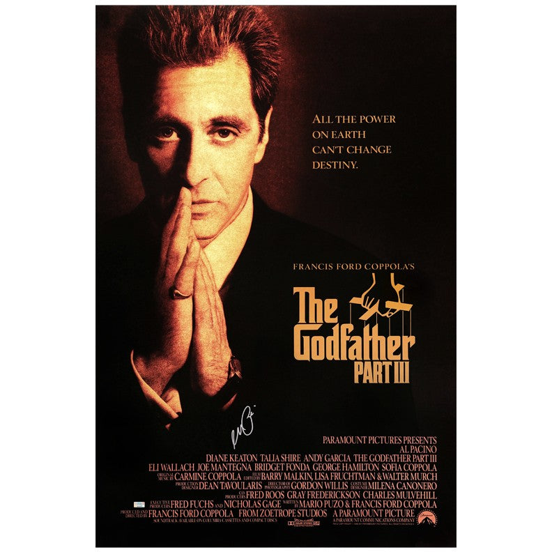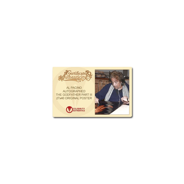 This 1990 The Godfather: Part III Original 27x40 Double-Sided Movie Poster has been personally hand-signed by Michael Corleone himself, Al Pacino during his signing with Celebrity Authentics. As Michael Corleone (Al Pacino) ages, he finds that being the head of the Corleone crime family isn't getting any easier. He wants his family out of the Mafia, but the mob kingpin (Eli Wallach) isn't eager to let one of the most powerful and wealthy families go legit. Making matters even worse is Michael's nephew, Vincent (Andy Garcia). Not only does Vincent want a piece of the Corleone family's criminal empire, but he also wants Michael's daughter, Mary (Sofia Coppola). Ships affixed with Celebrity Authentics serial-numbered and tamper evident Authentication Hologram and includes Celebrity Authentics Certificate of Authenticity featuring picture of Al signing poster. Please note: with multiples signed by the actor, a sample photo is used from stock to represent what you will receive. Exact autograph size and placement may vary.