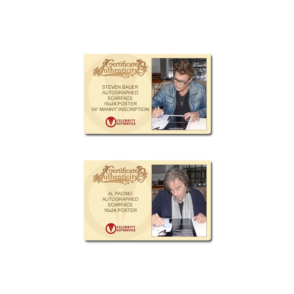 This 1983 Scarface 16x24 Movie Poster has been personally autographed by film legends Al Pacino, Michelle Pfeiffer and Steven Bauer during their signings with Celebrity Authentics! Tony Montana manages to leave Cuba during the Mariel exodus of 1980. He finds himself in a Florida refugee camp but his friend Manny has a way out for them: undertake a contract killing and arrangements will be made to get a green card. He's soon working for drug dealer Frank Lopez and shows his mettle when a deal with Colombian drug dealers goes bad. He also brings a new level of violence to Miami. Tony is protective of his younger sister but his mother knows what he does for a living and disowns him. Tony is impatient and wants it all however, including Frank's empire and his mistress Elvira Hancock. Once at the top however, Tony's outrageous actions make him a target and everything comes crumbling down. A very rare piece of Scarface memorabilia ships affixed with Celebrity Authentics serial-numbered Authentication hologram and includes Celebrity Authentics Certificates of Authenticity featuring picture of Al, Michelle and Steven signing poster.Please note: with multiples signed by the actor, a sample photo is used from stock to represent what you will receive. Exact autograph size and placement may vary.