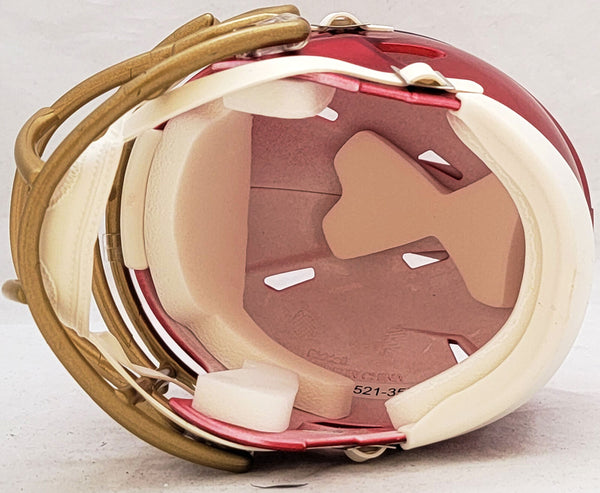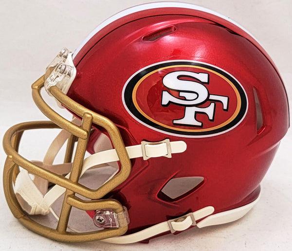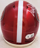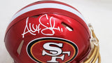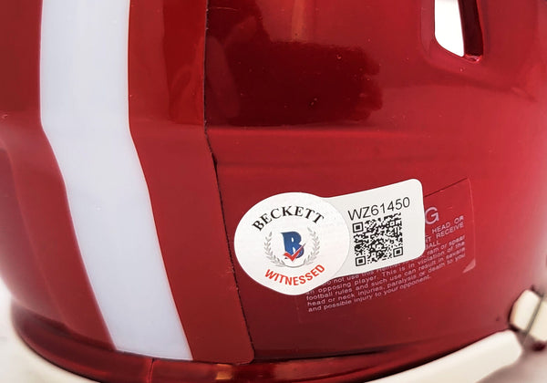 This is a San Francisco 49ers Flash Red Speed Mini Helmet that has been hand signed by Alex Smith. The Flash helmets are delicate and may have some marks or scratches on them. This item has been witnessed and certified authentic by Beckett Authentication (BAS) and comes with their tamper-proof witness sticker. Beckett Authentication has recently changed their physical certificate card policy where they no longer match their tamper-proof sticker with a physical certificate. A certificate can be printed on Beckett's website for the matching authentication number.