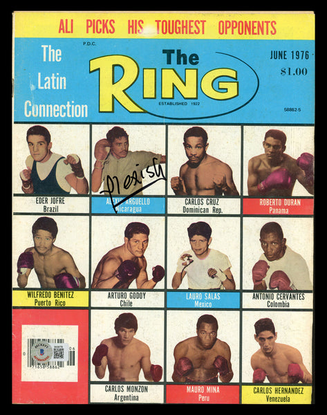 This is a Ring Magazine that has been hand signed by Alexis Arguello. There are creases in the item as shown. This item has been certified authentic by Beckett Authentication (BAS) and comes with their tamper-proof QR Code hologram that can be verified on the Beckett-authentication.com.
