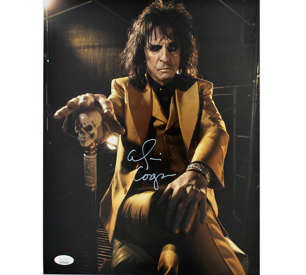 An Alice Cooper Unframed 11x14 Photo - Sitting Legs Crossed with Cane hand signed by Alice Cooper. The item and signature are in excellent condition. Alice Cooper is a singer, songwriter and actor. His career spans over 50 years. AUTHENTICATION: The item is accompanied by a JSA Certificate of Authenticity - JSA Serial Numbered & Databased Hologram.