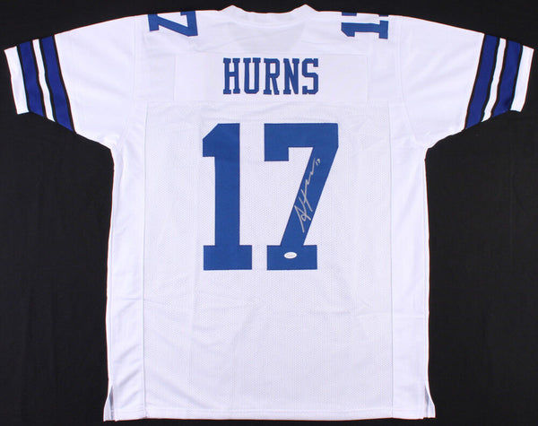 Custom on-field style jersey. Everything is sewn on, size XL. Hand-signed in silver paint pen by Allen Hurns. The lot / autograph(s) includes an official James Spence Authentication (JSA) hologram and matching COA for authenticity purposes. The signing of this item was witnessed by JSA.Authentication: JSA COA