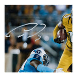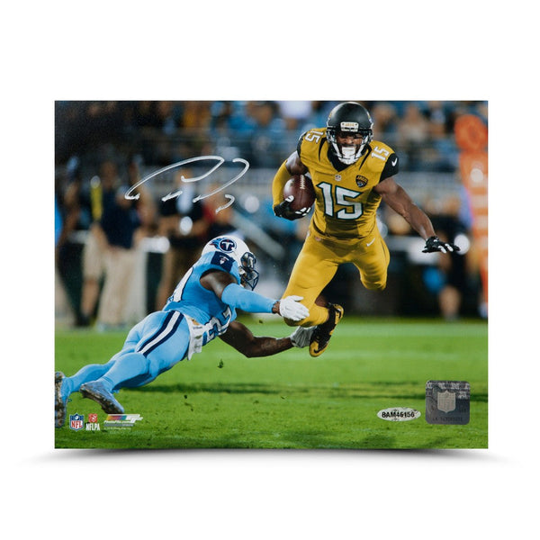 Incredible athleticism is often used to label Jacksonville Jaguars wide receiver Allen Robinson. The Penn State grad not only utilizes his supreme athletic abilities to get open, he also uses the same power and body control to make some of the most amazing catches around. He started that trend at Penn State when he made "The Catch" in the final minute of a 2014 game against Michigan. He even honored that moment with a tattoo on the right side of his body. In this image, he's leaping over the tackle in a game against the Tennessee Titans. Robinson has signed this "Airborne" 8" x 10" image in silver paint pen. His signature is deemed authentic by virtue of Upper Deck Authenticated's Five Step Process.