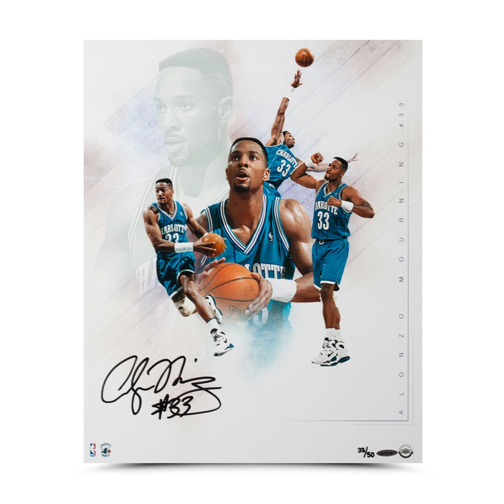 A three-time All-America center at Georgetown, Alonzo Mourning came into the NBA with a reputation for being a shot-blocker with a blossoming offensive game. It didn't take the second overall pick of the 1992 NBA Draft long to establish his reputation as that and so much more. Zo was a First Team All-Rookie selection after averaging 21 points, 10.3 rebounds and 3.5 blocks per game. He put his name among the game's greats when he earned All-Star status in each of the following four seasons. Although his career in Charlotte lasted only three seasons – he was traded to the Miami Heat on 11/3/95 – he made an indelible mark on the young franchise. In his final season in Charlotte, he led the way to a 50-win season and a return to the playoffs. The Hall of Fame center averaged 21.3 points, 10.1 rebounds and 3.2 blocks per game in his 215-game Hornets career. Mourning has signed this limited edition (50) Buzz Collage 16" x 20" image in black paint pen. His signature is deemed authentic by virtue of Upper Deck Authenticated's Five Step Process.