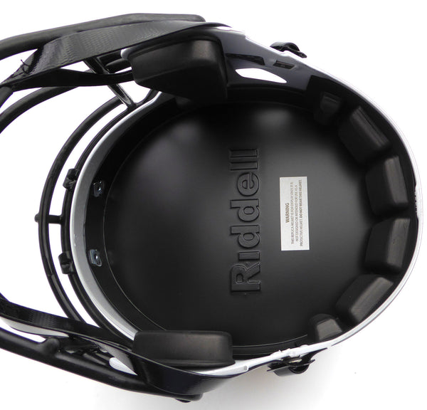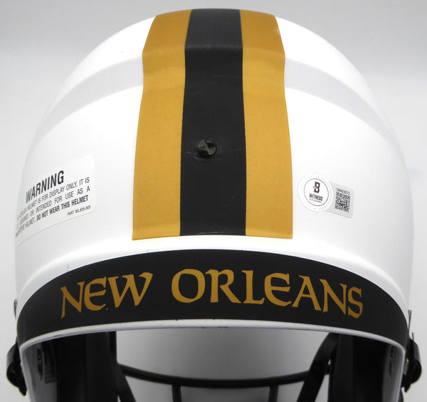 This is a Lunar Eclipse White Full Size Replica Helmet that has been hand signed by Alvin Kamara. There are marks on the item as shown. This item has been certified authentic by Beckett Authentication (BAS) and comes with their tamper-proof QR Code sticker that can be verified on the Beckett-authentication.com.