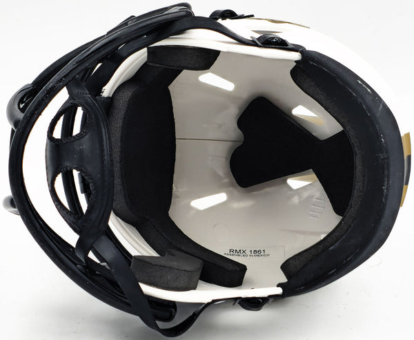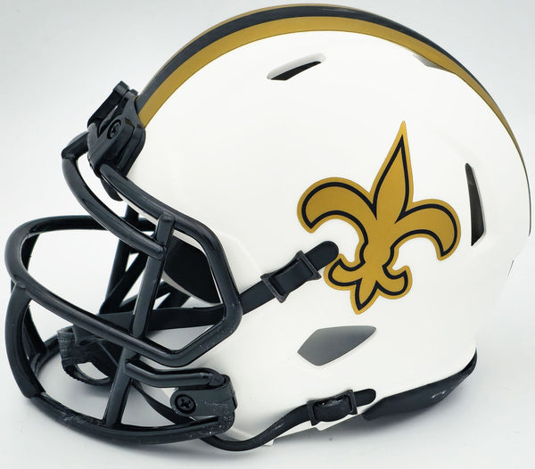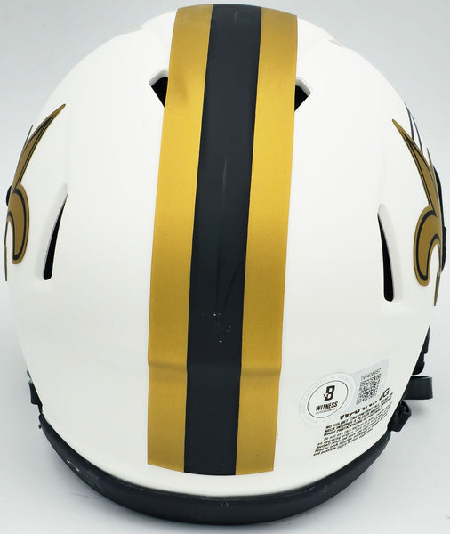 This is a New Orleans Saints Lunar Eclipse White Speed Mini Helmet that has been hand signed by Alvin Kamara. The Eclipse helmets are delicate and may have some marks or scratches on them. This item has been witnessed and certified authentic by Beckett Authentication (BAS) and comes with their tamper-proof witness sticker.