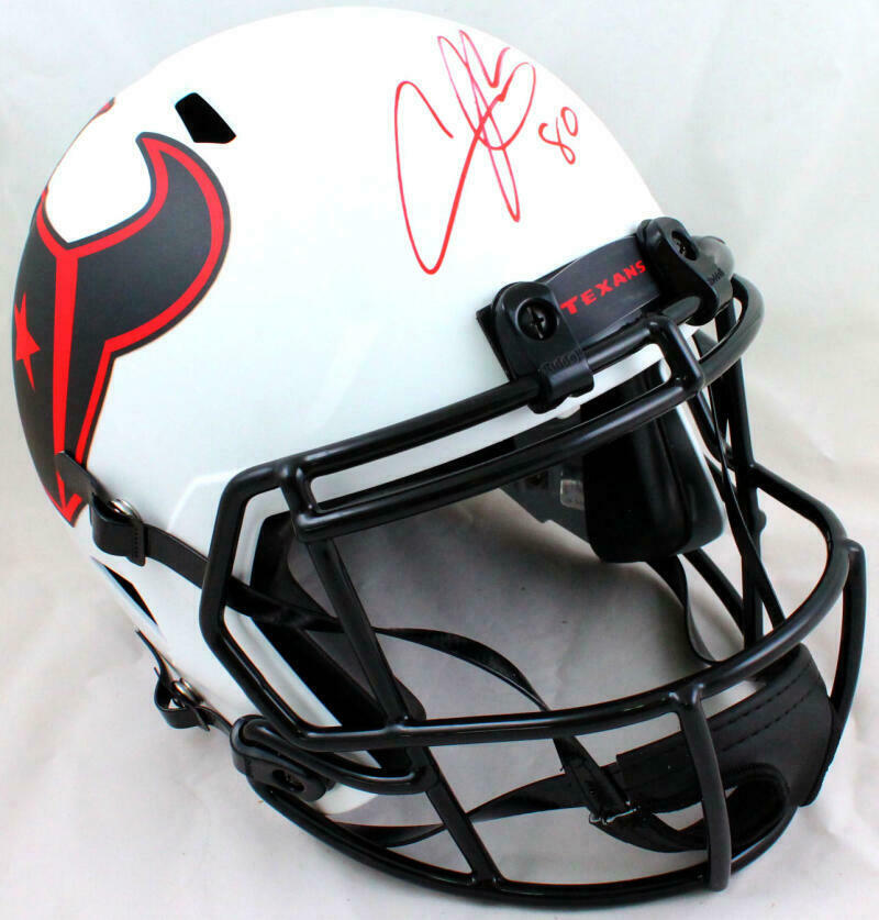 Andre Johnson Autographed Houston Texans F/S Lunar Speed Helmet-JSA W Auth *Red This is a hand autographed Helmet of Andre Johnson of the Houston Texans. This is a Riddell Football Full Size Lunar Speed Replica Helmet. This item has a James Spence Witness Protection Authentication, which comes with a numbered sticker and a matching JSA Certificate of Authenticity. You can view this item on the SpenceLOA website and it shows when and where the item was signed. It was signed either at a public autograph appearance or a private signing. This is a stock photo of the item. Although you may not receive this exact item, the item you receive is virtually identical and brand new in great shape.