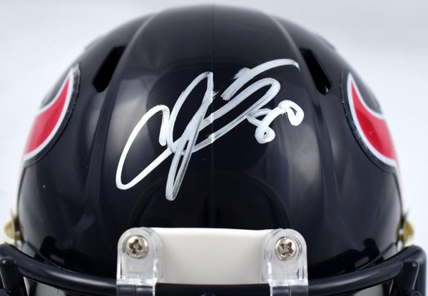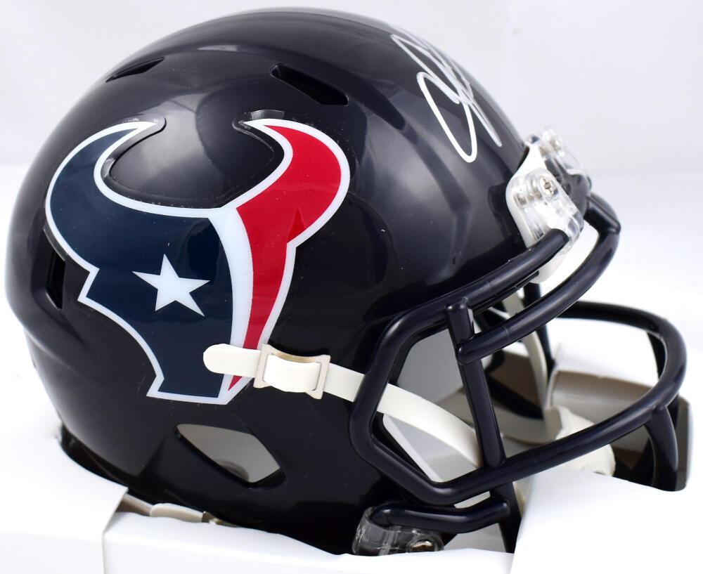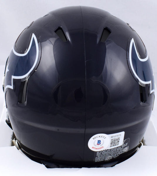 Andre Johnson Autographed Houston Texans Speed Mini Helmet- Beckett W Hologram *Silver This is a hand autographed Mini Helmet of Andre Johnson of the Houston Texans. This is a Riddell Football Speed Mini Helmet. This item has a Beckett Witness Authentication, which comes with a numbered sticker hologram and a QR code for verification. You can view this item on the Beckett website and it shows when and where the item was signed. It was signed either at a public autograph appearance or a private signing. This is a stock photo of the item. Although you may not receive this exact item, the item you receive is virtually identical and brand new in great shape.