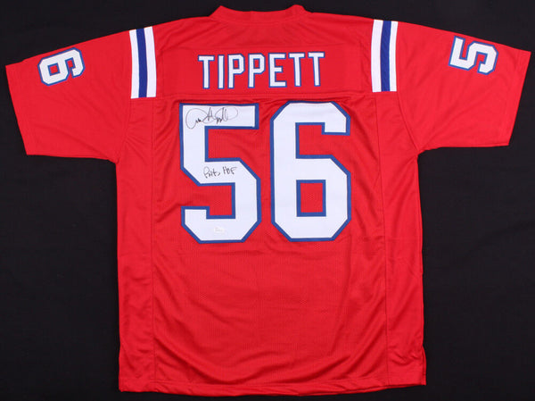 Custom throwback on-field style jersey. Everything is sewn on, size XL. Hand-signed and inscribed in black felt-tip pen by Andre Tippett (HOF).From 1984-85, Tippett recorded the highest two-season sack total by a linebacker in NFL history, totaling 35.0 sacks during the two seasons. His 18.5 sacks in 1984 are the third most by any linebacker in a single season, while his 16.5 sacks in 1985 are tied for the sixth most by any linebacker in NFL history. The lot / autograph(s) includes an official James Spence Authentication (JSA) hologram and matching COA for authenticity purposes. The signing of this item was witnessed by JSA.Authentication: JSA COA