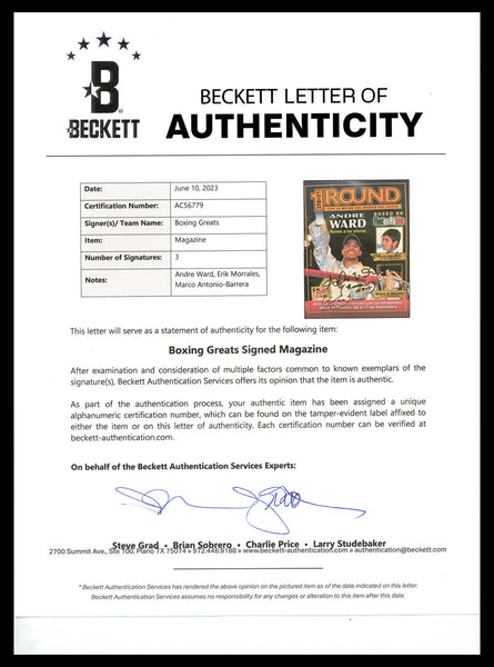 This is a Primer Round magazine that has been hand signed by Andre Ward, Erik Morales & Marco Antonio Barrera. This item has been certified authentic by Beckett Authentication (BAS) and comes with their Tamper-Proof Hologram and matching full-page certificate of authenticity.