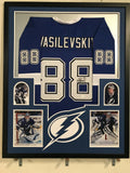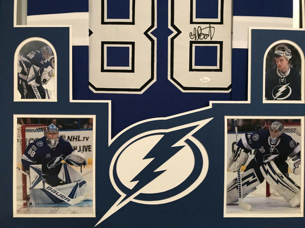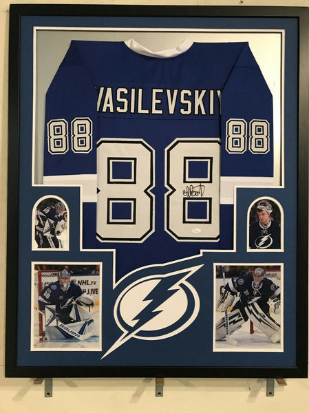 Custom frame measures approximately 34" x 42" in size and features a jersey which has been hand-signed in black felt-tip pen by Andrei Vasilevskiy. Includes an official James Spence Authentication (JSA) hologram and matching COA for authenticity purposes. The signing of this item was witnessed by JSA.Authentication: JSA COA