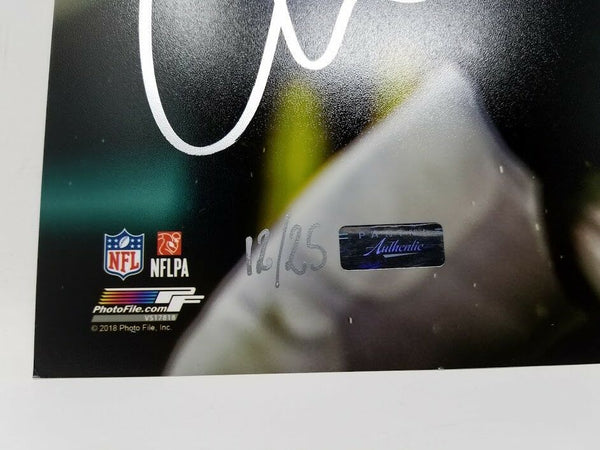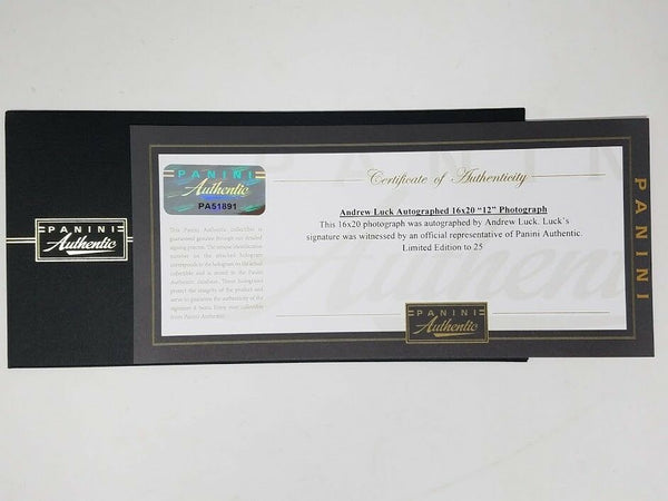 Andrew luck hand autographed 16 x 20 "12" photograph - panini authenticated - limited edition 12 of 25 #12 is the undoubted leader of the indianapolis colts franchise. when andrew luck began his career in 2012, he immediately cemented himself as a star player as he went 11-5 in each of his first 3 seasons while being selected to the pro bowl in each of those years. luck is one of the most talented passers in the nfl today and looks to fight for the lombardi trophy with a string of new talented players around him. commemorate the leader of the colts with this autographed 16x20 photograph! this andrew luck autographed photograph includes a panini authentic certificate of authenticity with a unique hologram number that corresponds to the hologram on the actual image. these holograms protect the integrity of the product and serve to guarantee the authenticity of the signature it bears.winning bidder will receive number "12" from the edition.