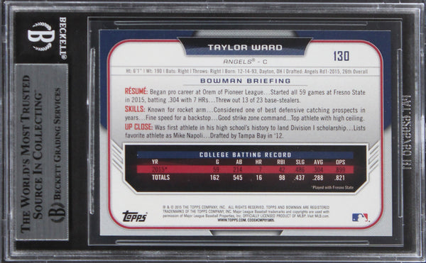 This Autographed 2015 Bowman Draft #130 Card has been Personally Signed by Taylor Ward of the Los Angeles Angels. This item is 100% Authentic, it comes slabbed and authenticated by Beckett Authentication Services. The authenticity can be verified on Beckett Authentication Services website.