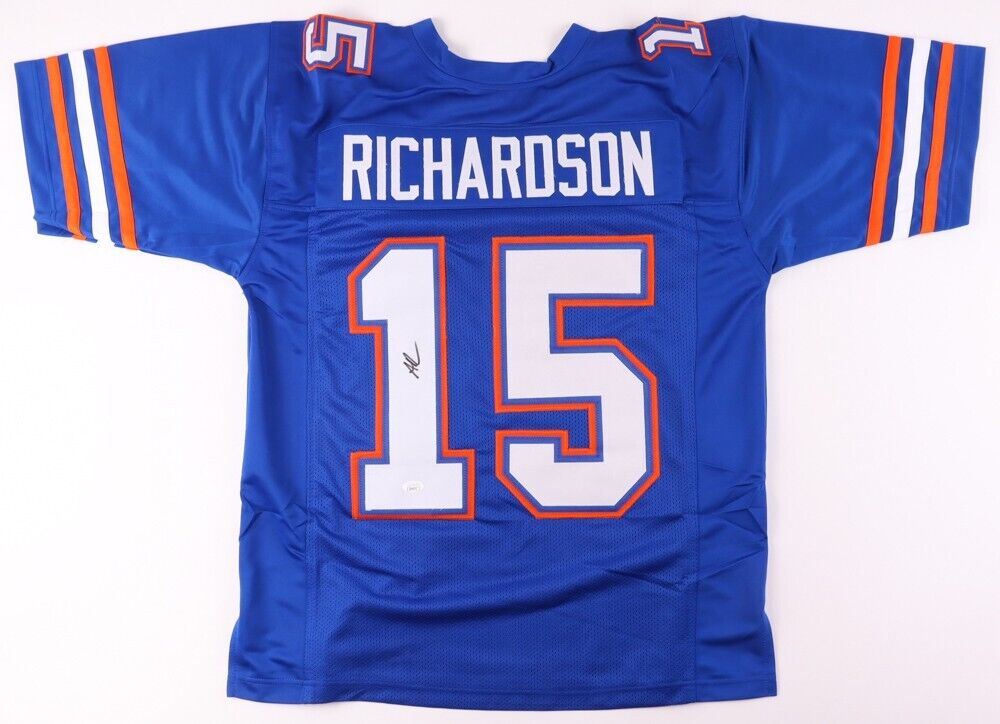 Custom jersey with everything sewn on, size XL. Hand-signed by Anthony Richardson.The autograph(s) includes an official James Spence Authentication (JSA) hologram and matching COA for authenticity purposes.Authentication: JSA COACustom on-field style jerseys are a more affordable option for autograph seekers. These jerseys do not have any brand name or tags and are made in the Philippines. They feature stitched on names and numbers and are made to look very similar to the on-field jerseys that the players wear. These custom jerseys are very commonly used in the memorabilia industry.