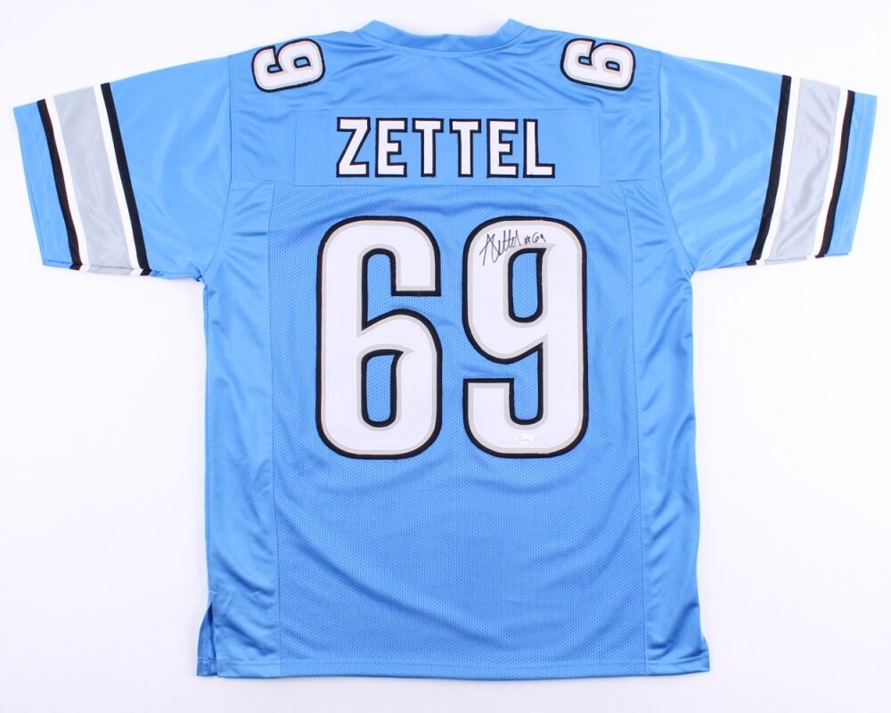 Custom on-field style jersey. Everything is sewn on, size XL. Hand-signed in black felt-tip pen by Anthony Zettel. The autograph includes an official James Spence Authentication (JSA) hologram and matching COA for authenticity purposes. The signing of this item was witnessed by JSA.Authentication: JSA COA