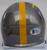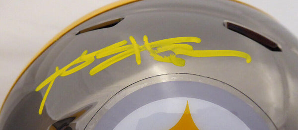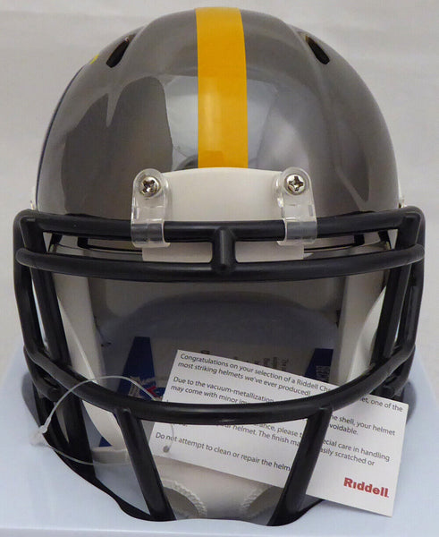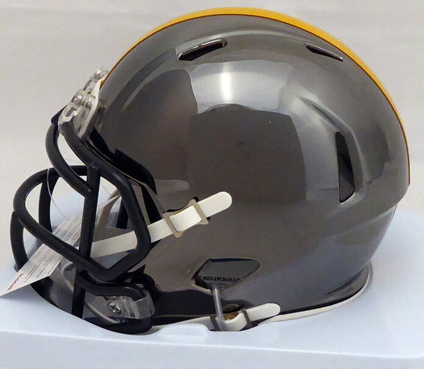 This is a Pittsburgh Steelers Black Chrome Speed Mini Helmet that has been hand signed by Antonio Brown. This item has been certified authentic by Beckett Authentication (BAS) and comes with their sticker and matching certificate of authenticity. NOTE: There is a smudge in the signature, as shown in the pictures.