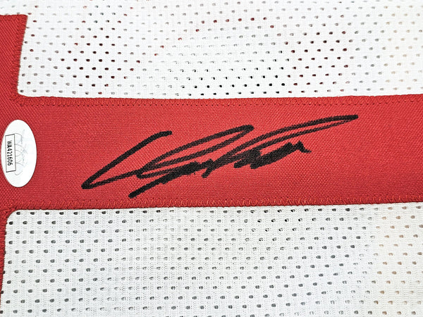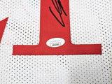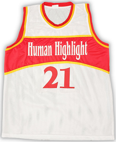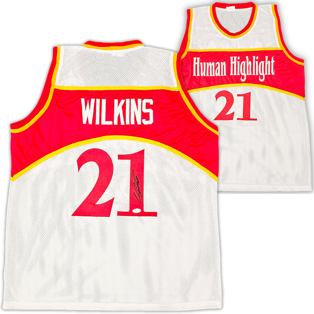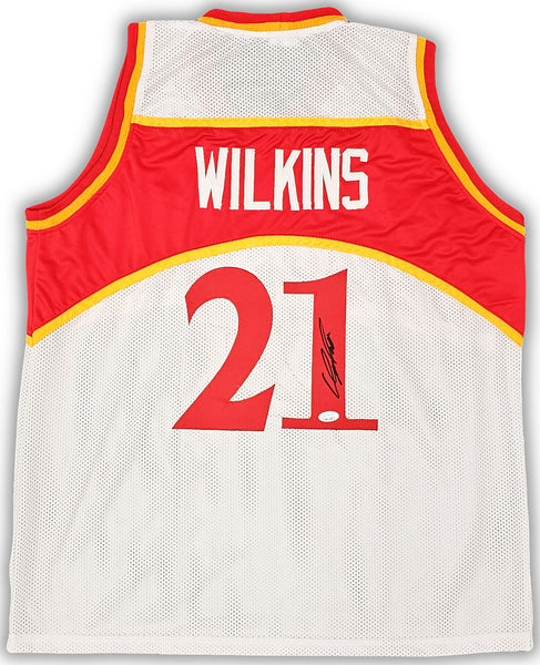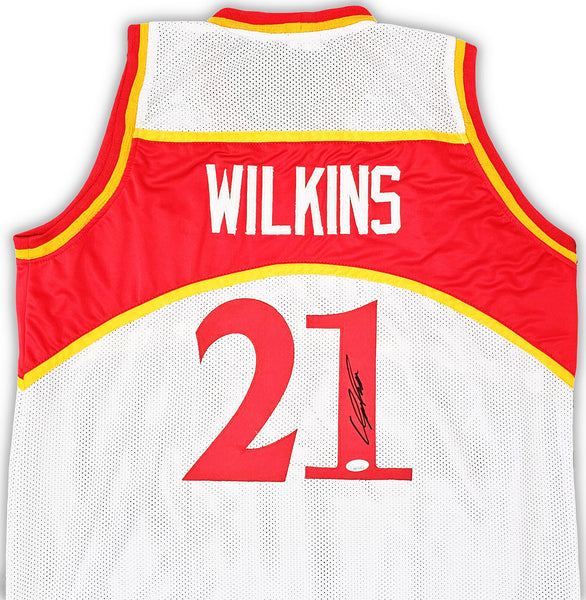 This is a White Jersey that has been hand signed by Dominique Wilkins. This is a custom jersey with no name brand. The approximate size is XL. It has nice sewn in name and numbers. This item has been certified authentic by JSA and comes with their tamper-proof sticker and matching certificate of authenticity.