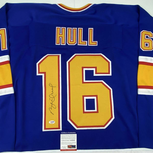 Autographed/Signed BRETT HULL St. Louis Retro Blue Hockey Jersey PSA/DNA COA This is a custom jersey and was not manufactured by or in any manner associated with any professional sports league or manufacturer. This custom jersey carries no professional sports league designation. The item is intended to be an autographed collectible. Reference of team in the title is to allow the purchaser a point of association. The custom jersey displays the name, number and authenticated signature of the player. This item in no way is affiliated with or connected to any professional sports organization. The autograph, as always is guaranteed to be authentic and has been certified as authentic by a third-party, trusted authenticator. Size is XL unless otherwise noted.