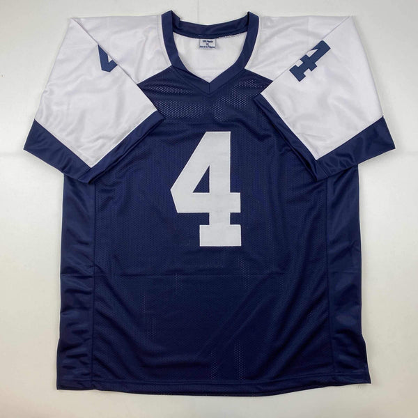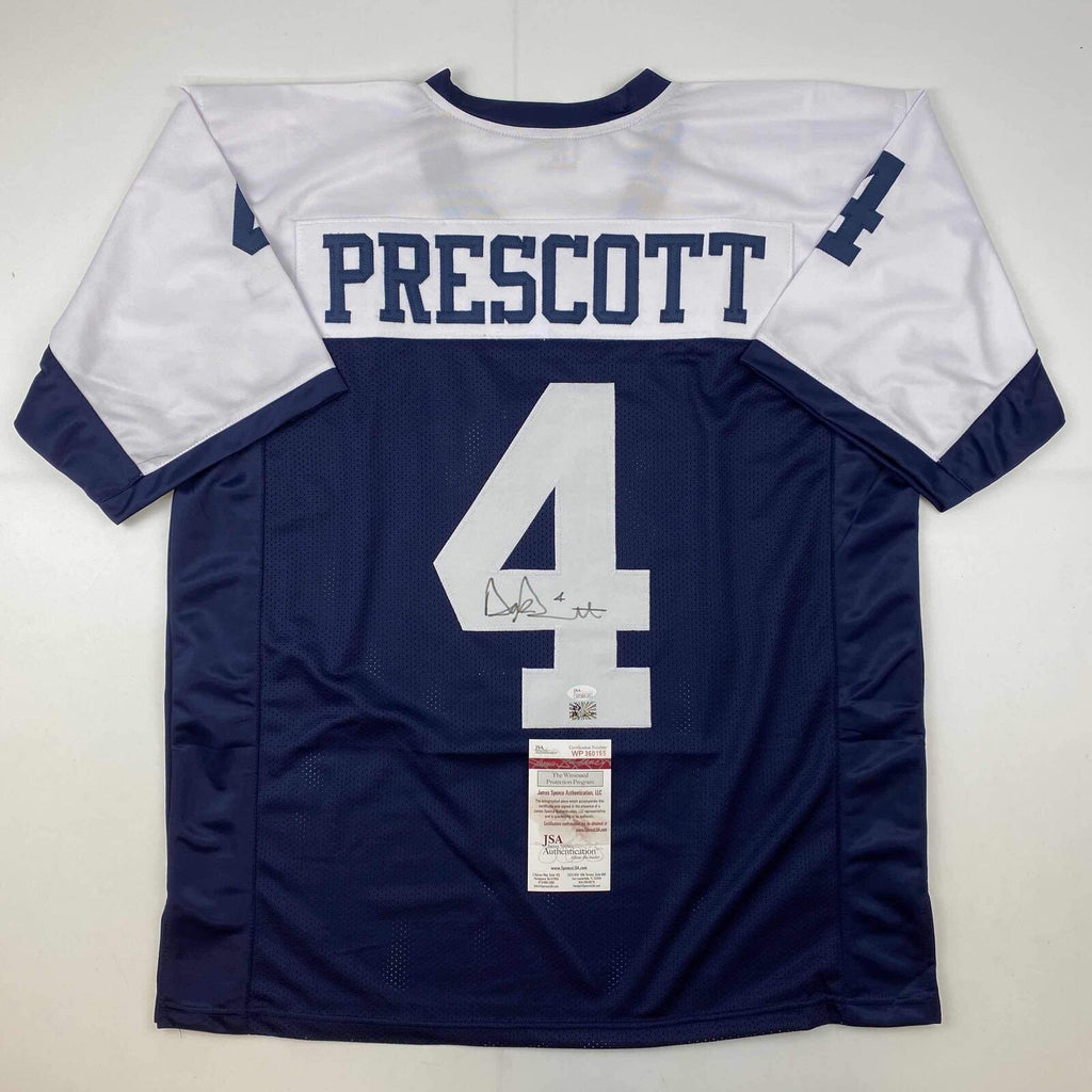 Autographed/Signed Dak Prescott Dallas Thanksgiving Day Football Jersey JSA COA Jersey has no brand names or logos. This is a custom jersey and was not manufactured by or in any manner associated with any professional sports league or manufacturer. This custom jersey carries no professional sports league designation. The item is intended to be an autographed collectible. The custom jersey displays the name and number of the player. This item in no way is affiliated with or connected to any professional sports organization. Size is XL.