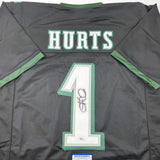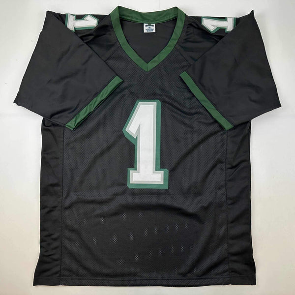 Autographed/Signed Jalen Hurts IMPERFECT #1 Philadelphia Black Jersey PSA COA Autograph has bled considerably. Item is being sold as-is at a $100 discount off the regular list price. Severity of the bleed may vary, jersey is being sold as-is. Please look closely at the third image closeup of the autograph. Jersey has no brand names or logos. This is a custom jersey and was not manufactured by or in any manner associated with any professional sports league or manufacturer. This custom jersey carries no professional sports league designation. The item is intended to be an autographed collectible. The custom jersey displays the name and number of the player. This item in no way is affiliated with or connected to any professional sports organization. Size is XL