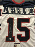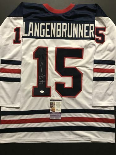 Autographed/Signed JAMIE LANGENBRUNNER Team USA Olympics Hockey Jersey JSA COA This is a custom jersey and was not manufactured by or in any manner associated with any professional sports league or manufacturer. This custom jersey carries no professional sports league designation. The item is intended to be an autographed collectible. Reference of team in the title is to allow the purchaser a point of association. The custom jersey displays the name, number and authenticated signature of the player. This item in no way is affiliated with or connected to any professional sports organization. The autograph, as always is guaranteed to be authentic and has been certified as authentic by a third-party, trusted authenticator. Size is XL unless otherwise noted.
