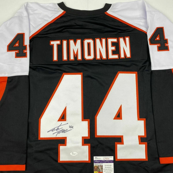 Autographed/Signed KIMMO TIMONEN Philadelphia Black Hockey Jersey JSA COA Auto This is a custom jersey and was not manufactured by or in any manner associated with any professional sports league or manufacturer. This custom jersey carries no professional sports league designation. The item is intended to be an autographed collectible. The custom jersey displays the name, number and authenticated signature of the player. This item in no way is affiliated with or connected to any professional sports organization. The autograph, as always is guaranteed to be authentic and has been certified as authentic by a third-party, trusted authenticator. Size is XL unless otherwise noted.