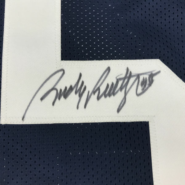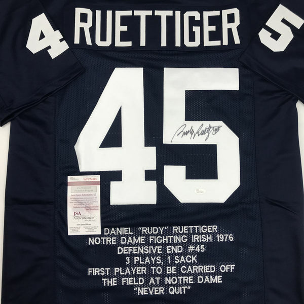 Autographed/Signed RUDY RUETTIGER Notre Dame Irish Blue Stat Jersey JSA COA This is a custom jersey and was not manufactured by or in any manner associated with any professional sports league or manufacturer. This custom jersey carries no professional sports league designation. The item is intended to be an autographed collectible. Reference of team in the title is to allow the purchaser a point of association. The custom jersey displays the name, number and authenticated signature of the player. This item in no way is affiliated with or connected to any professional sports organization. The autograph, as always is guaranteed to be authentic and has been certified as authentic by a third-party, trusted authenticator. Size is XL unless otherwise noted.